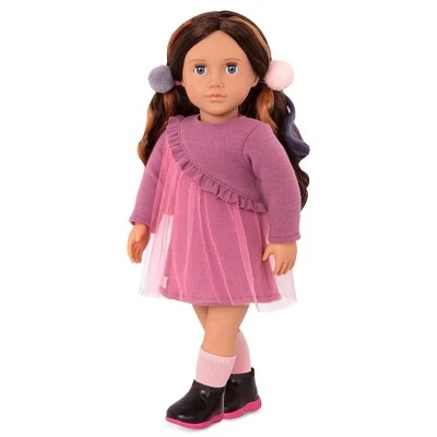 Create fun hairstyles with Bridget! This Our Generation 18-inch hair play doll has dark-blue eyes that open and close with long brown hair that’s fun to brush and style! Start styling with the 5 colored hair clip-in accessories to give Bridget new styles! Easily insert the colored hair strands into the 9 head openings under Bridget’s hair to add streaks and beautiful layers for a tonal look. The embossed clips will keep the hair strands secure as you tie pretty ponytails with the 2 pom pom elastics, and they easily camouflage under Bridget’s hair without having to hide the clip! Bridget has a soft body and can also rotate her arms and legs to easily change outfits for different fashion looks. She is wearing a purple sweater dress with a cute tulle overlay, pink socks, and easy-to-slip-on booties.
